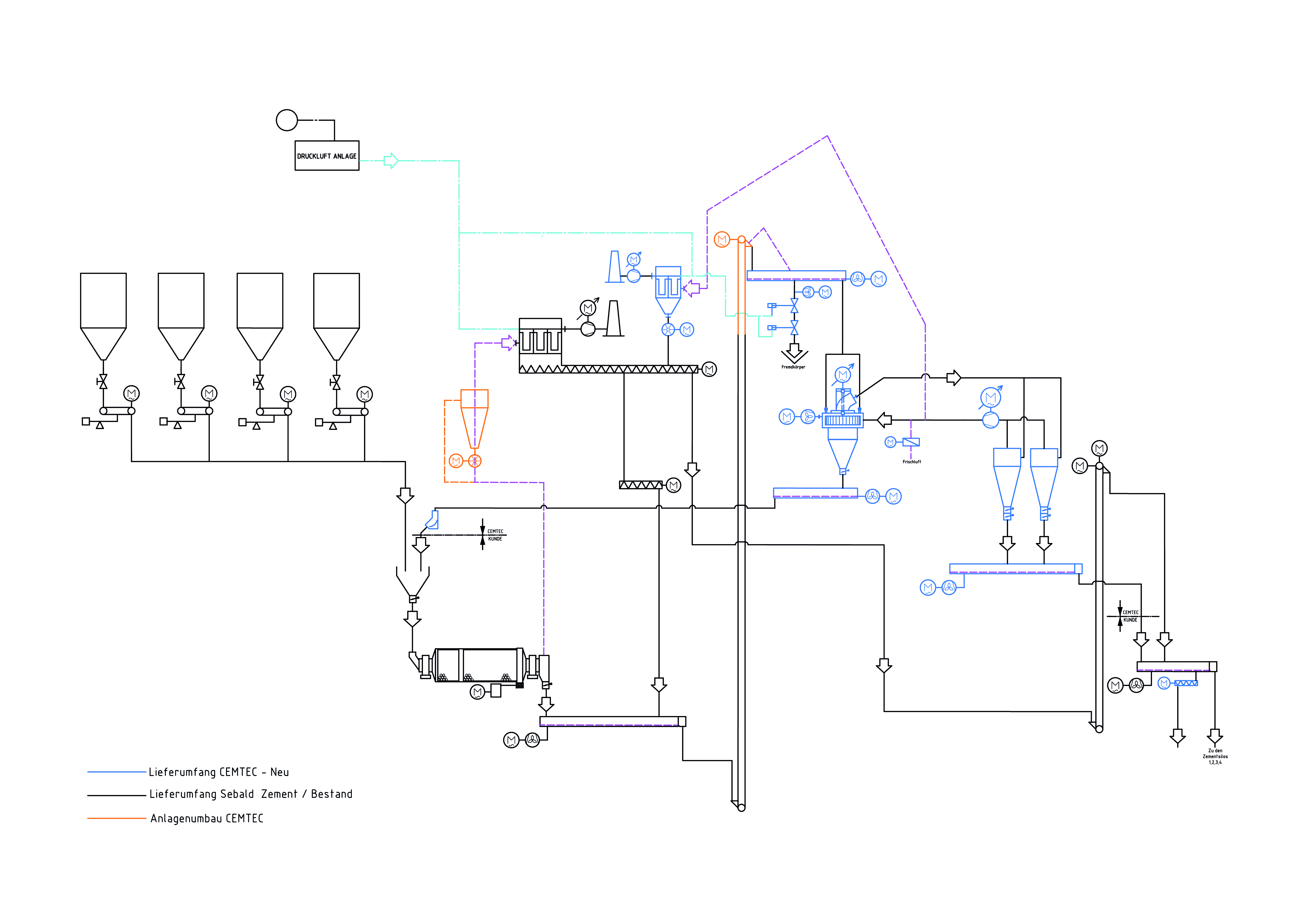 The existing cement mill (ø 2.8 x 13.75 m, 1500 kW) was originally equipped with a first-generation Polysius separator in 1975. Based on data from Sebald Zement, it was decided to replace the separator with a 75,000 m³/h Cemtec CTC-0075. The new separator operates in a closed air circuit with two dedusting cyclones and a bag house filter to remove the finest particles. The finished cement is transported to storage via existing equipment. The complete cement grinding line flowsheet, with new and modified equipment in blue and orange, is shown in Figure 2.